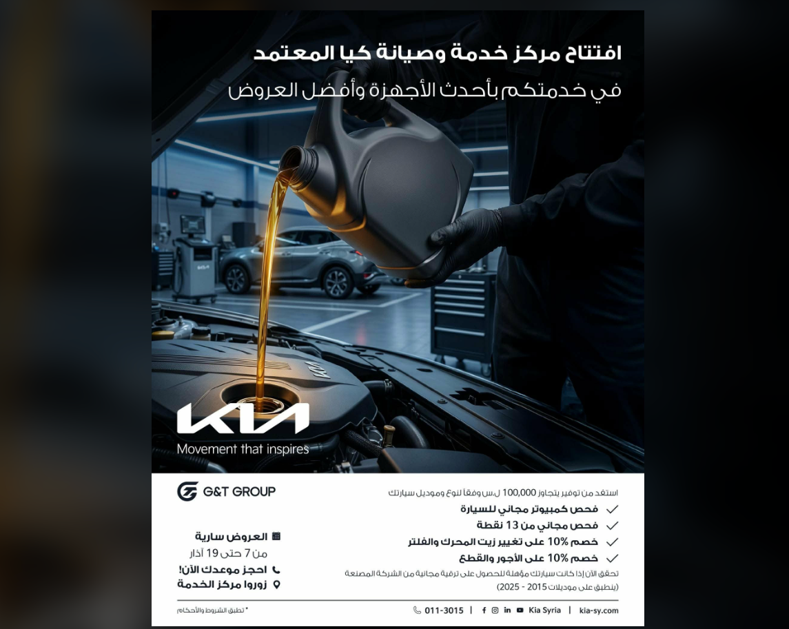 في خطوة استراتيجية تهدف إلى تعزيز خدمات ما بعد البيع والارتقاء بتجربة العملاء، تم الإعلان عن افتتاح مركز صيانة كيا المعتمد في سوريا، ليقدم خدمات الصيانة والدعم الفني لمالكي سيارات كيا وفق أعلى المعايير العالمية المعتمدة من الشركة المصنعة.ويأتي إطلاق المركز الجديد في إطار التزام العلامة التجارية بتطوير منظومة ...